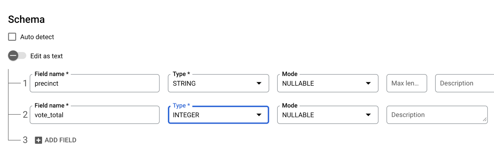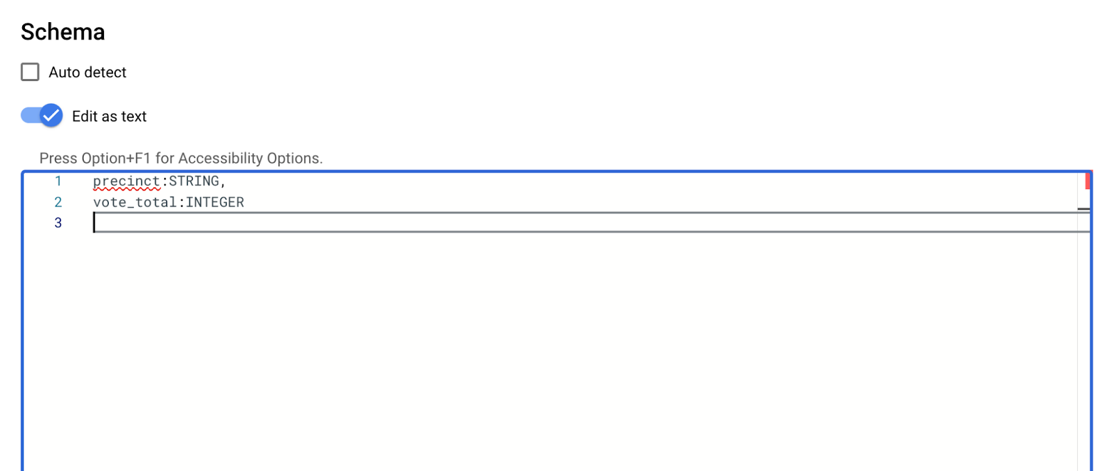 - Select “Auto Detect” for the schema. Or, you can also specify field names and datatypes manually, either by entering each field in the provided boxes, or editing as text.