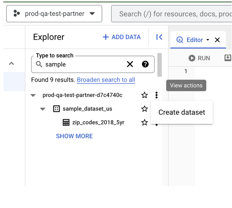 - From within your BigQuery Project, right-click on the three dots and select the “Create dataset”:
