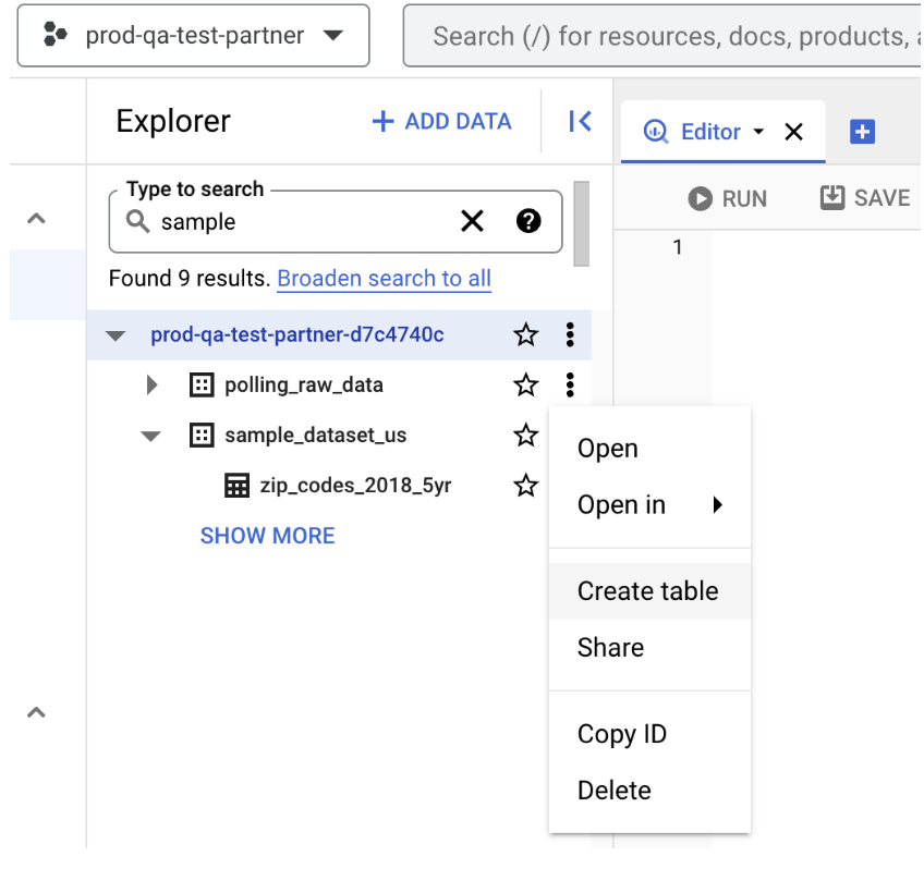 4. Next to the new dataset, right-click the actions menu and select “Create table”: