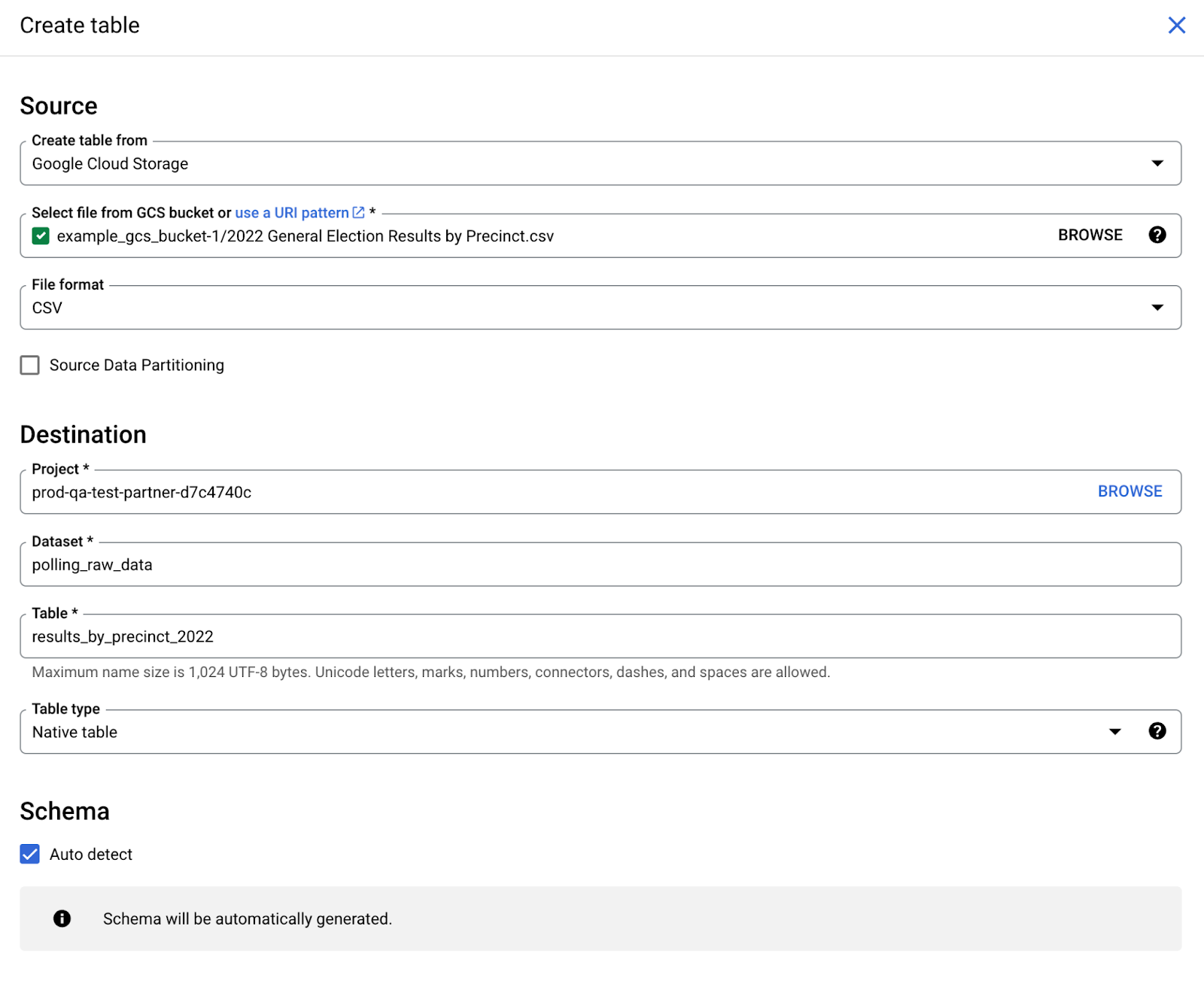 - Either select “Auto Detect” for the schema or manually add the schema fields for your table