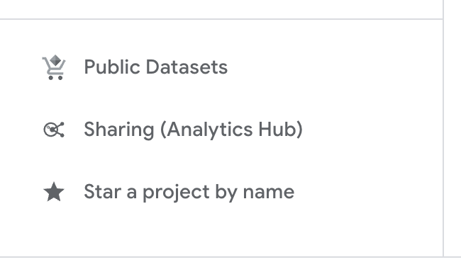 Access the public datasets Google provides (e.g., Census data): When you add the public datasets from BigQuery sharing, you can link them directly in your project, vs. having to navigate to the BigQuery public data project (more on that here). It’s the same data either way, but some folks prefer to have it directly in their project vs. navigating to a different project to access it.