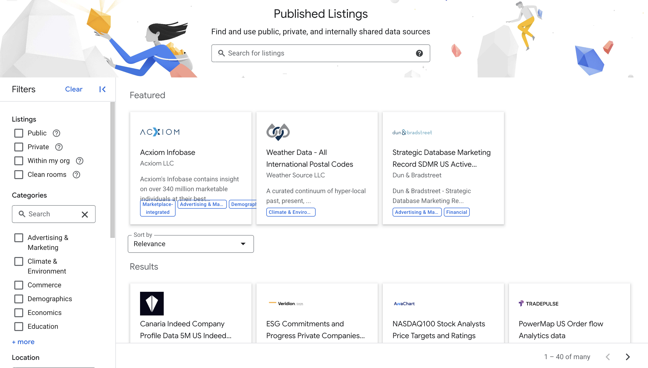 This will open up the BigQuery sharing, where you can search for listings by name or add filters on the left side to narrow down to only private listings available within your organization.