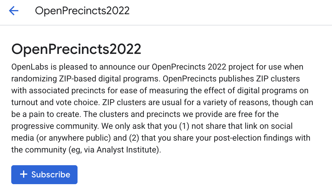- OpenLabs’ OpenPrecincts Data: PAD users can use this data to measure the effectiveness of their digital programs. The dataset includes a set of ZIP clusters and ZIP clusters-to-precincts matches. With this dataset, PAD users can randomize ZIP clusters in states and send premium digital advertising to the treatment clusters - examining turnout and persuasive impact post-election. You can read more about the data here.