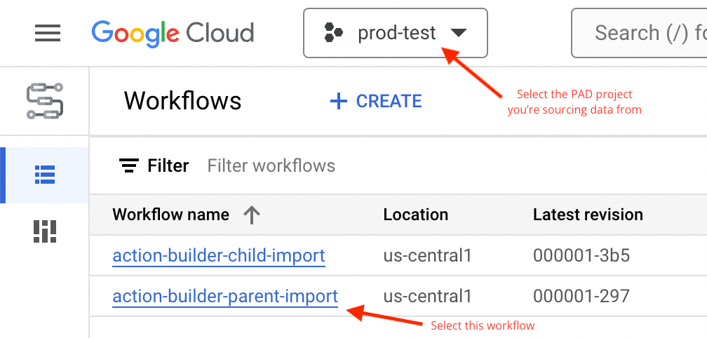 Navigate to https://console.cloud.google.com/workflows. If prompted, sign in to Google Cloud using your cta-pad.com account.